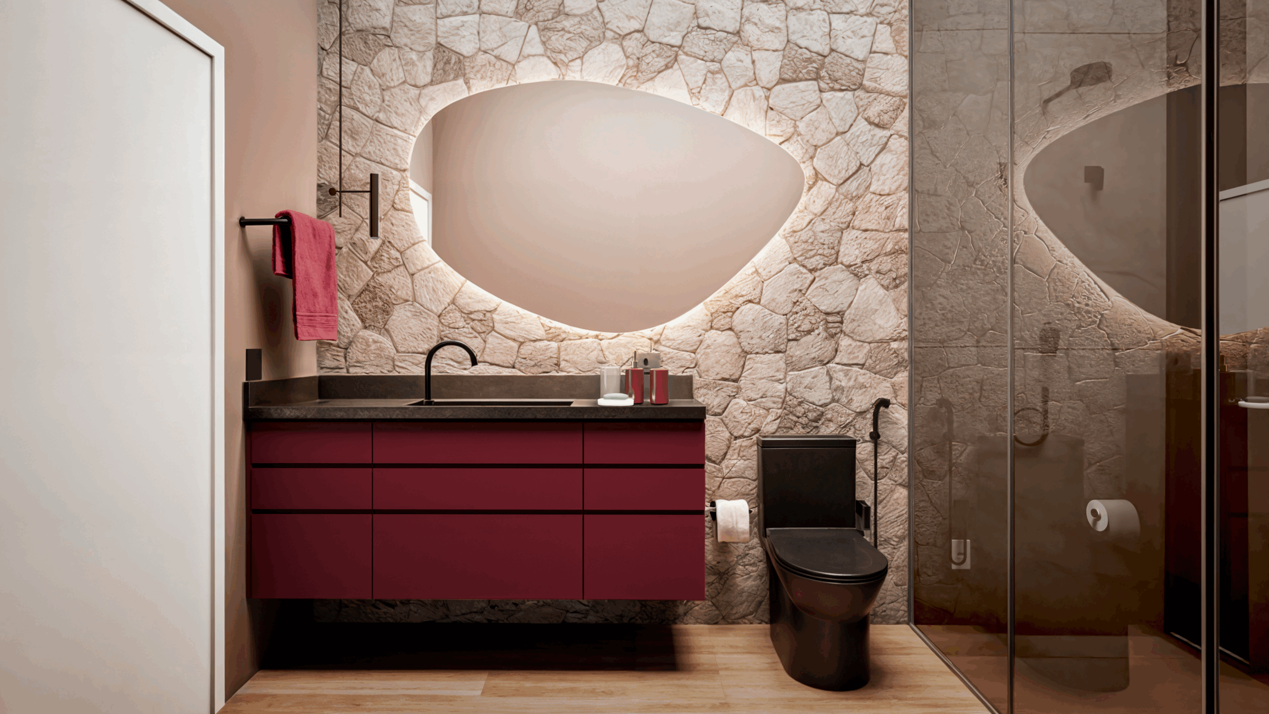 O projeto da “Casa da Bisa” é a tradução perfeita da arquitetura contemporânea que busca o acolhimento. A paleta de materiais, que mistura a sofisticação da madeira natural com a personalidade de pedras e cores vibrantes, como o Marsala e o Erva Mate, foi pensada para criar espaços integrados que abraçam os moradores.
