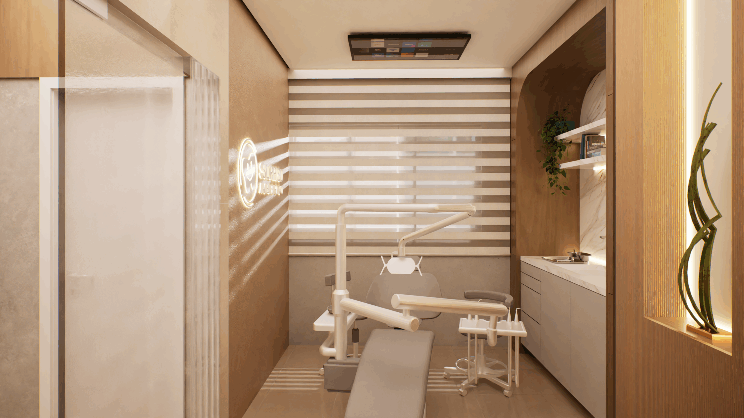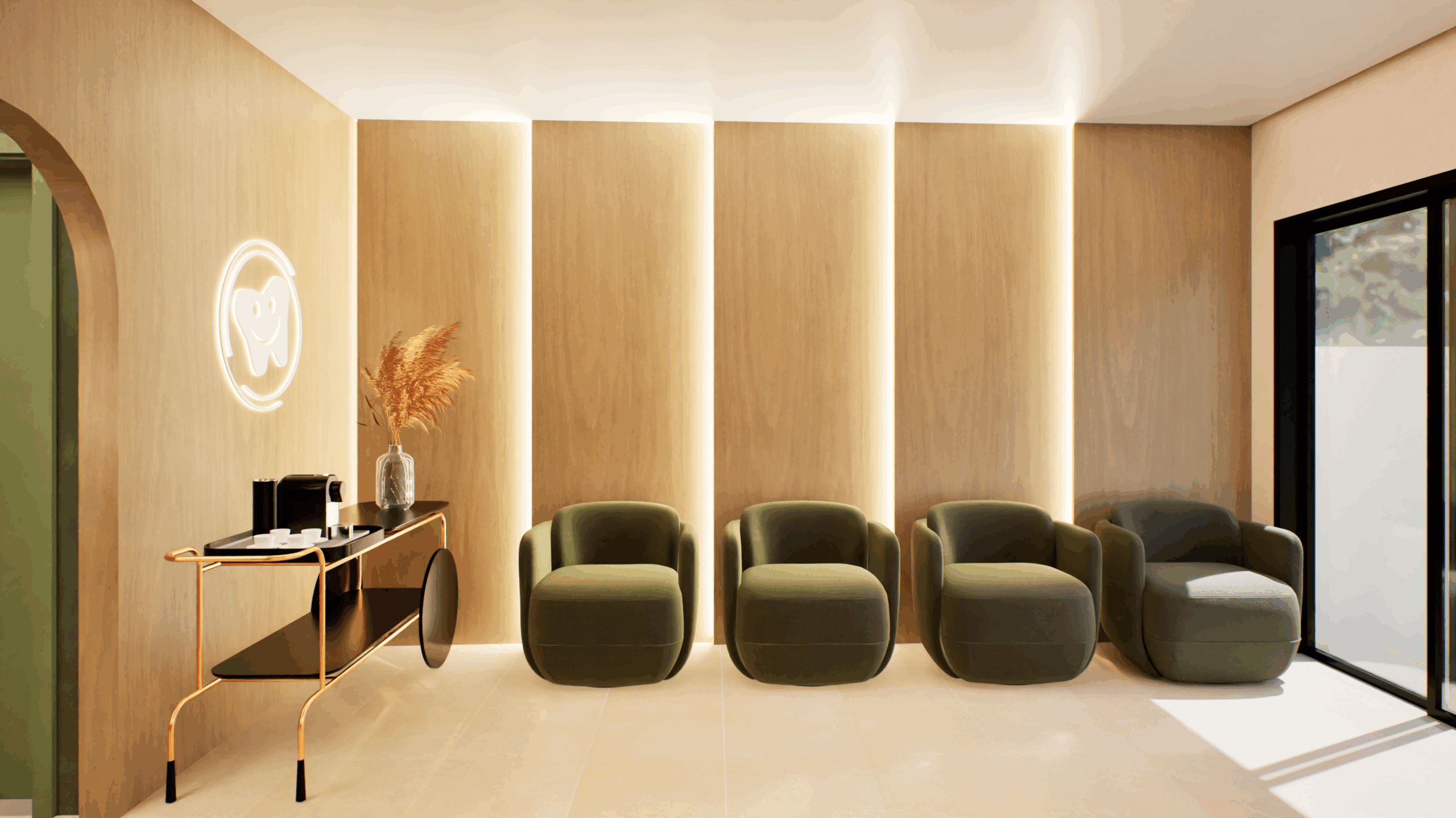 O ponto mais marcante do projeto é o uso estratégico das curvas. Presentes desde a recepção até os consultórios, elas criam uma sensação de fluidez e movimento, suavizando a arquitetura. Mais do que um detalhe de design, as curvas simbolizam o sorriso humano, gentil e orgânico que a clínica busca proporcionar aos seus pacientes.