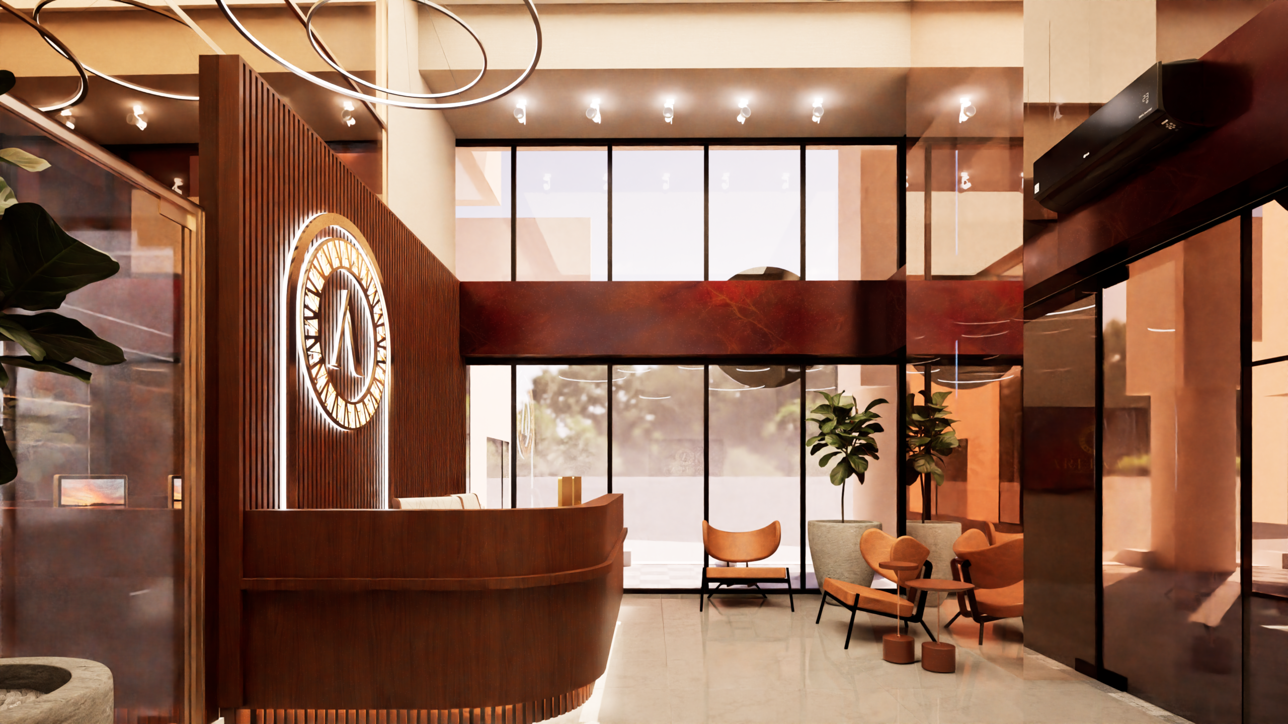 - Painéis Ripados: Madeira que traz calor e elegância à recepção.