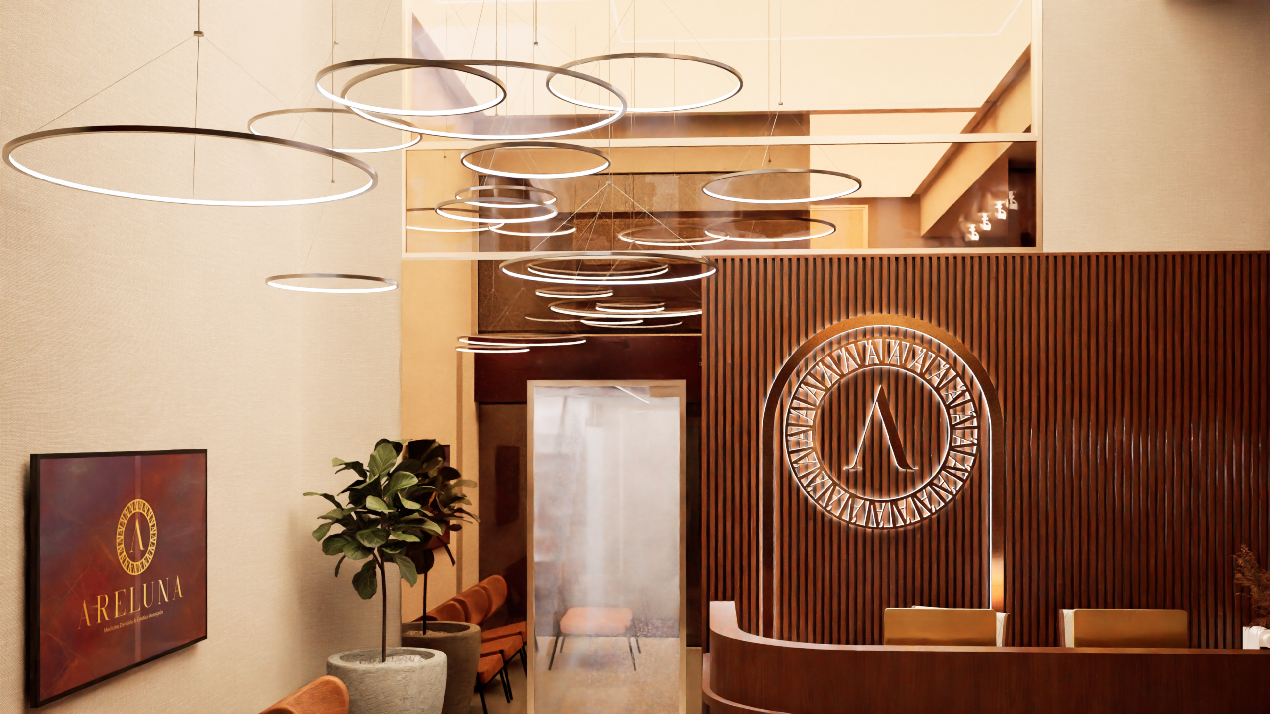 - Luminotécnica: Anéis de LED suspensos que conferem modernidade e identidade visual única.