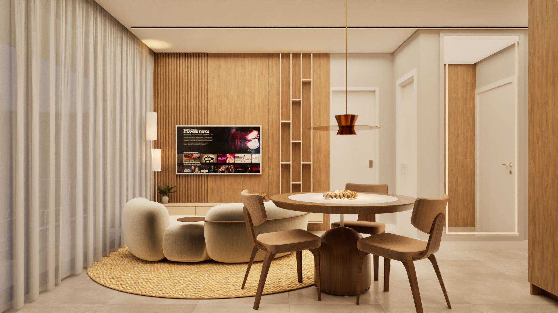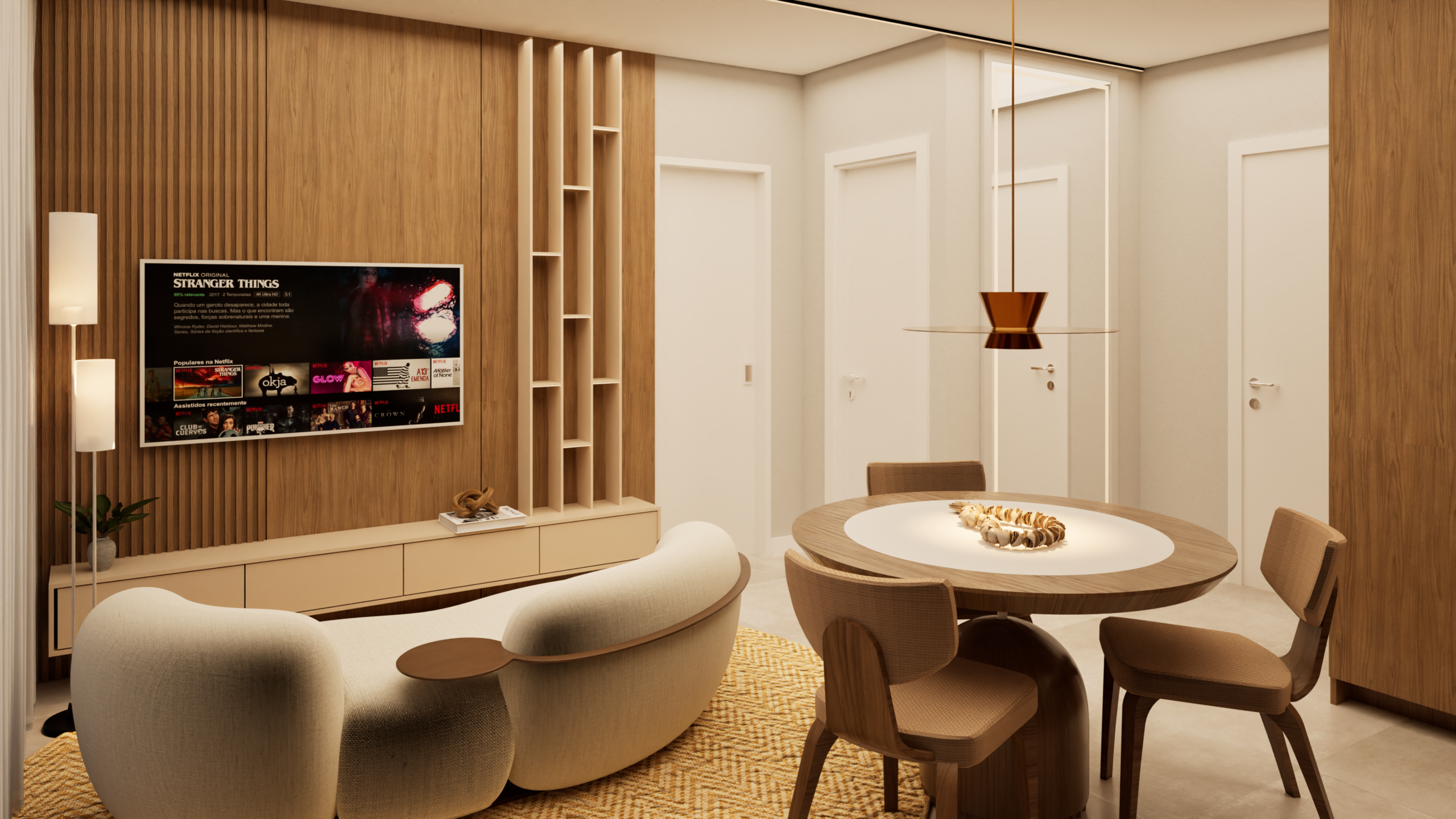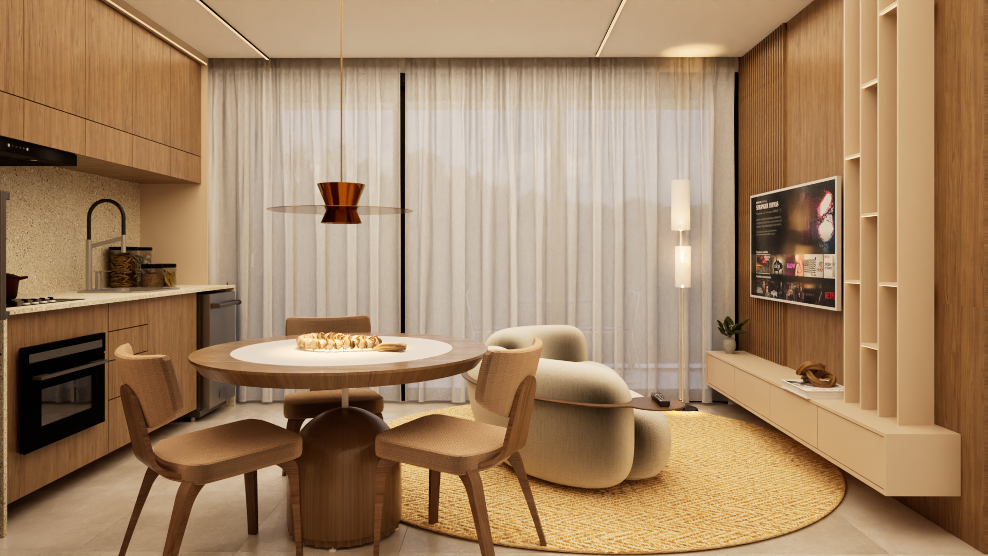 - Integração Total: A eliminação de barreiras visuais entre living, jantar e cozinha maximiza a percepção de amplitude, criando um ambiente contínuo e iluminado.