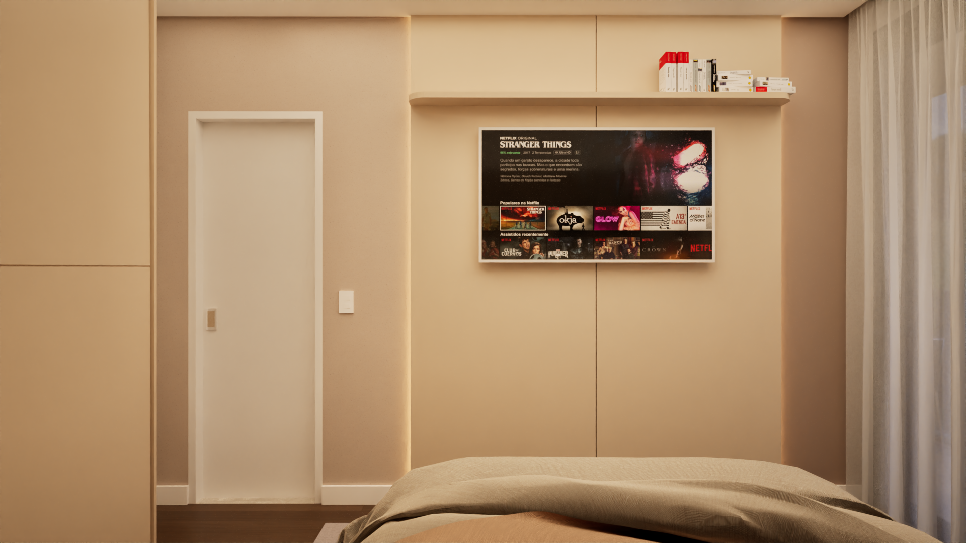 - Marcenaria Arquitetônica: Desenvolvida sob medida pelo nosso escritório de arquitetura, a marcenaria em tons amadeirados claros organiza o espaço, emoldura a tecnologia e oculta as áreas de serviço de forma elegante.