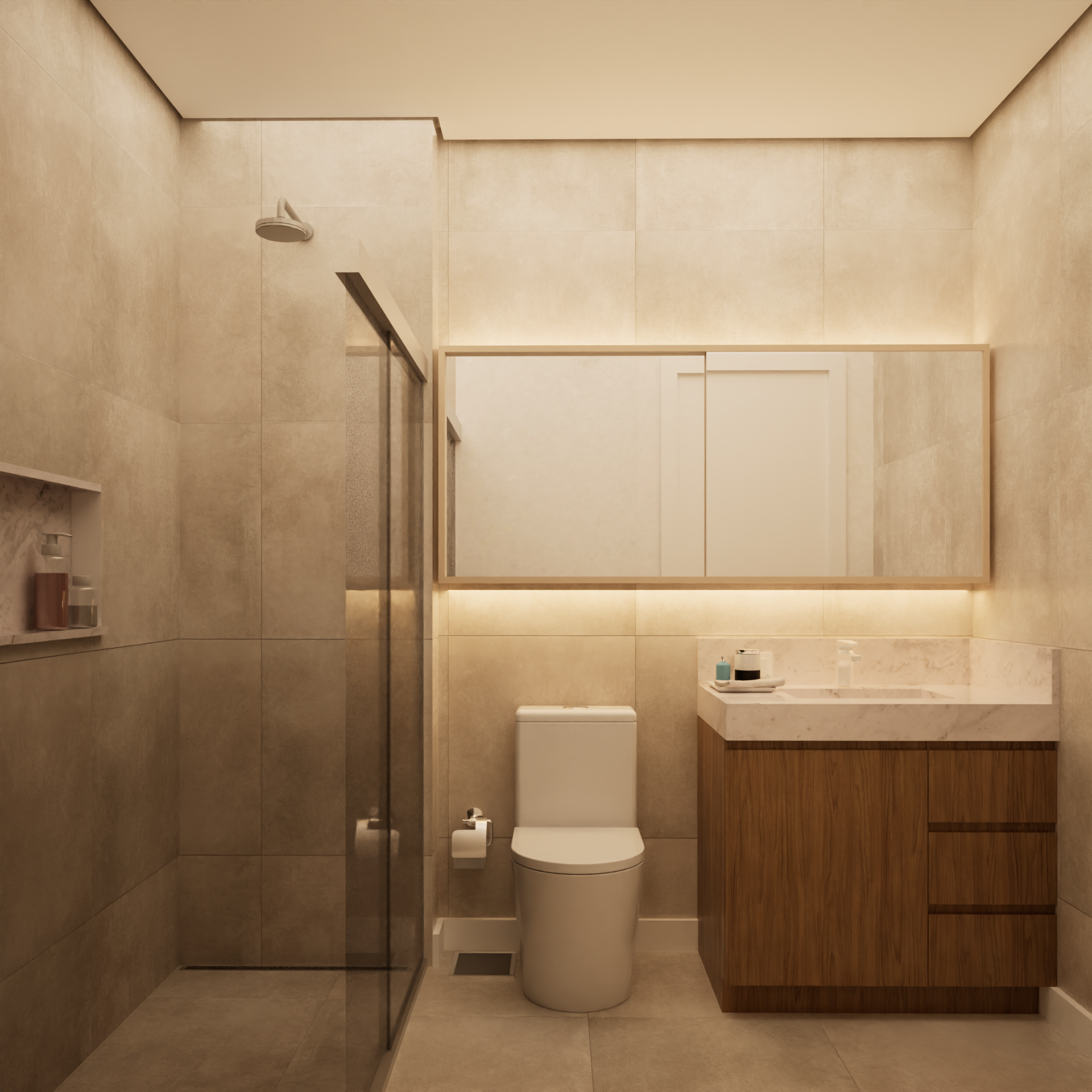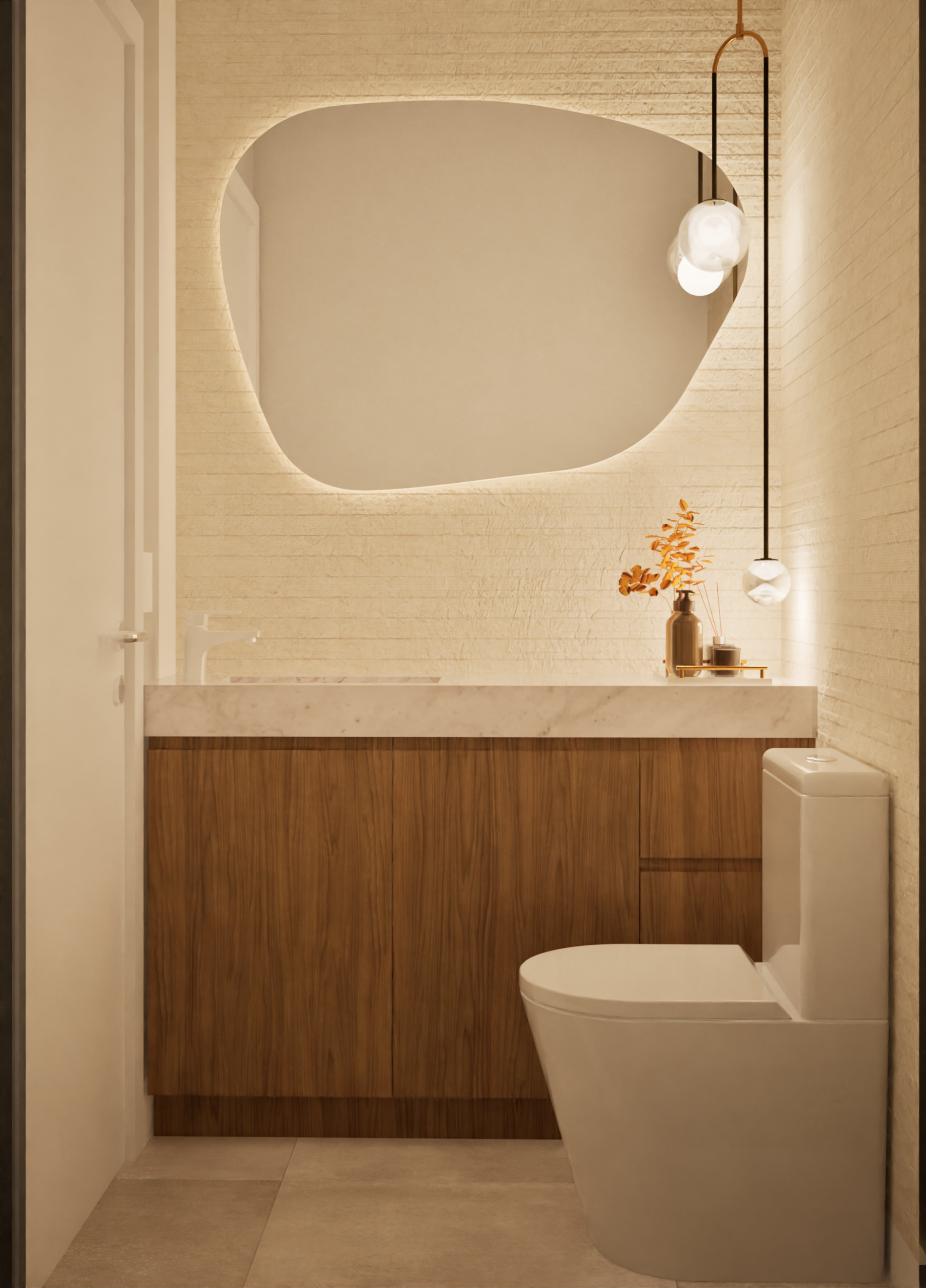 - Luz e Textura: Um projeto luminotécnico rigoroso, com foco em luz indireta, destaca a materialidade nobre das pedras e metais, elevando o bem-estar sensorial.