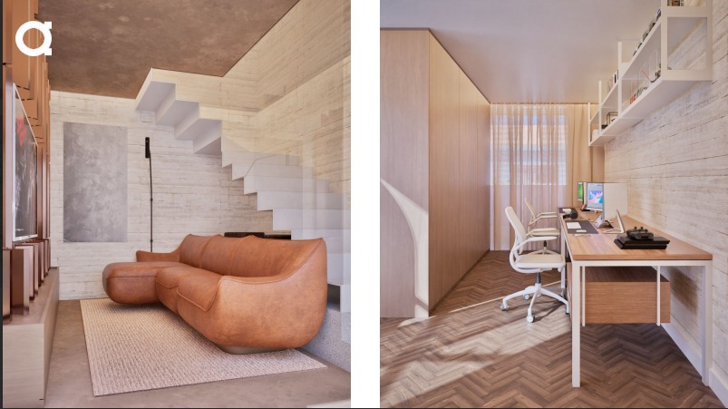 - Design Industrial-Chique: Uso de concreto aparente, metal e madeira (painéis ripados).