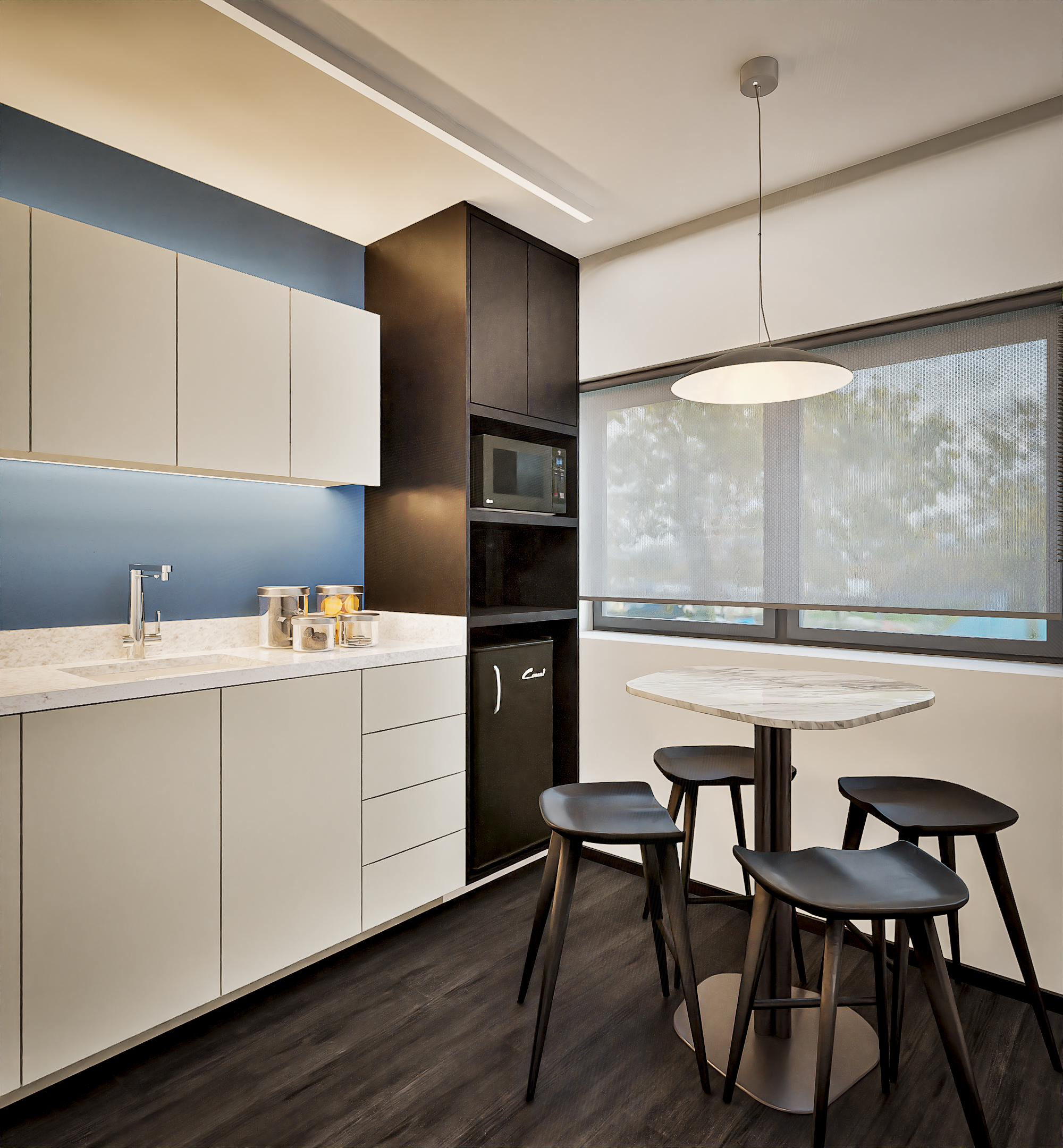 As salas de atendimento e copa foram discretamente incorporadas à arquitetura, favorecendo a continuidade visual. Já a sala de reuniões, posicionada estrategicamente na esquina do edifício, aproveita a luz natural e a vista, conferindo destaque ao ambiente onde ocorrem decisões importantes.