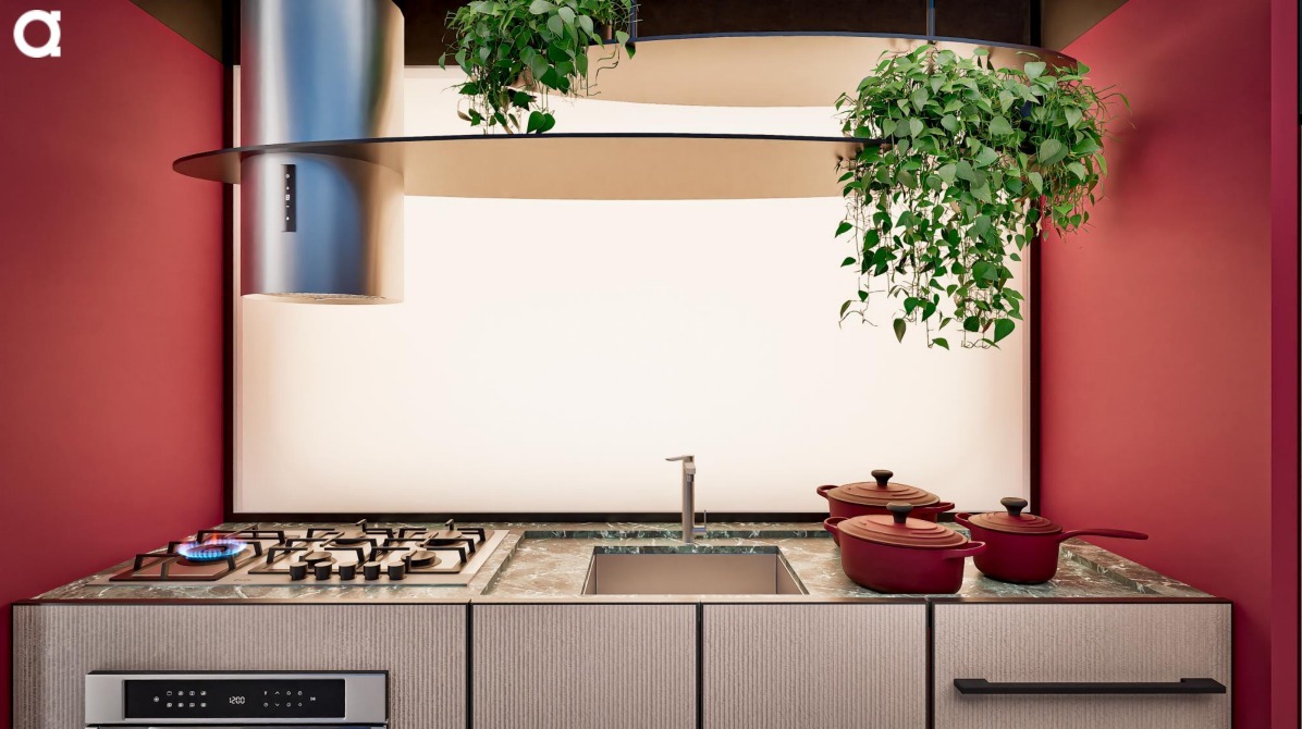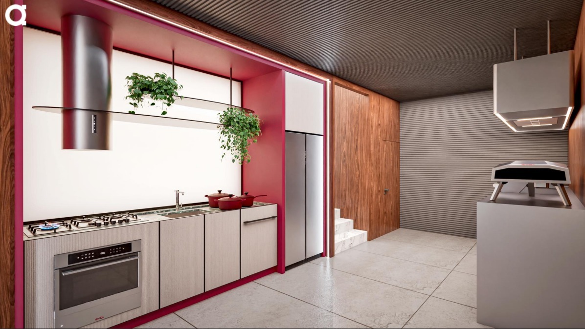 O grande destaque técnico e estético é a ilha suspensa, que mimetiza a volumetria da coifa. Esta solução inovadora, assinada pela Arthur Calliari Arquitetura, confere leveza e contemporaneidade ao espaço, ao mesmo tempo que demonstra maestria na composição formal. O resultado é um ambiente aspiracional e, ao mesmo tempo, plausível, onde os visitantes podem projetar seus próprios desejos e estilo de vida.