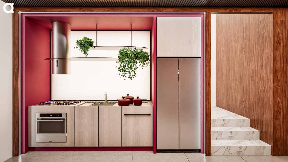 Para o primeiro espaço, a abordagem foi puramente artística e conceitual. Ao desvincular a cozinha de sua funcionalidade prática, o design pôde focar inteiramente no impacto visual e na valorização dos eletrodomésticos da linha Evol.