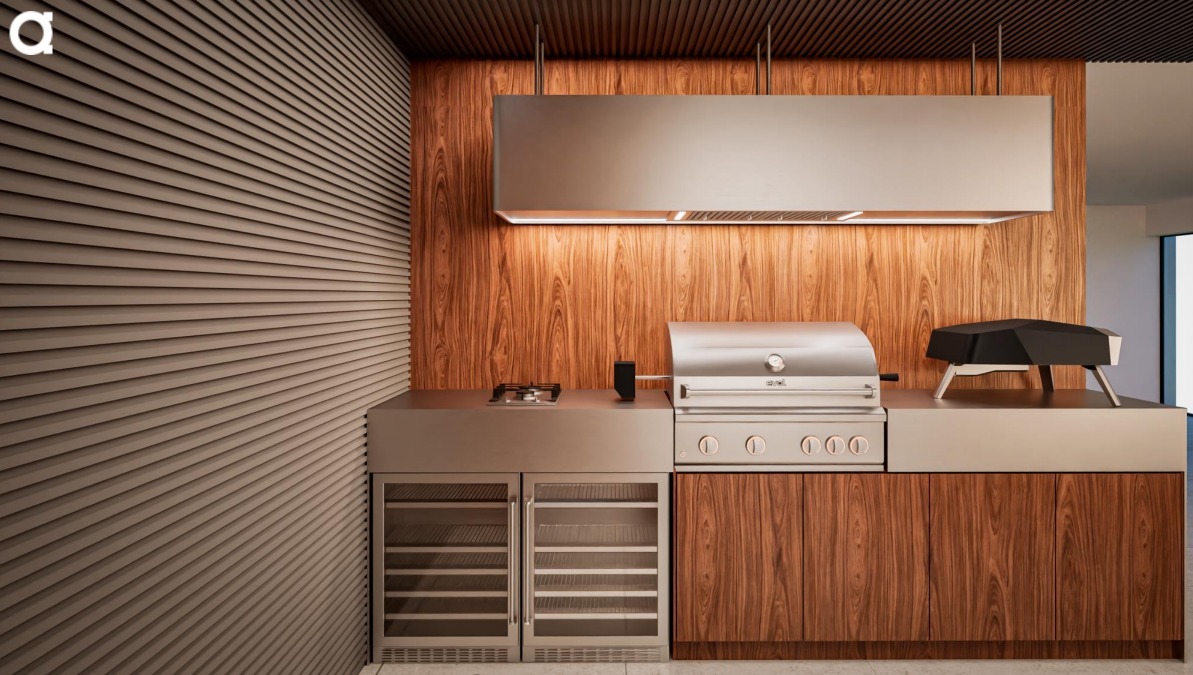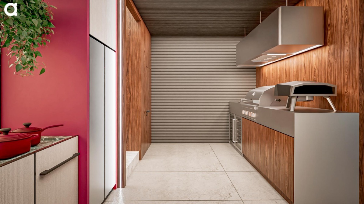 Em oposição, o segundo ambiente foi concebido para gerar identificação imediata. A área gourmet articula materiais de forte presença, como a madeira Pau-Ferro e o aço inox, criando um diálogo sofisticado entre o calor do natural e a precisão da tecnologia.